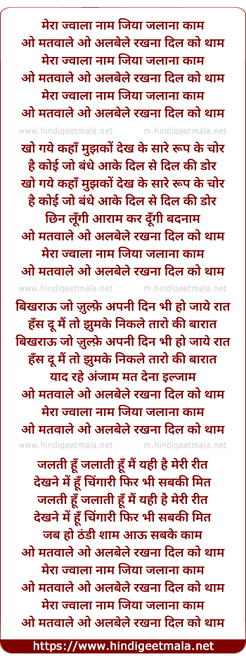 Lyrics of Mera Jwala Naam Jiya Jalana Kaam - मेरा ज्वाला नाम जिया जलाना काम