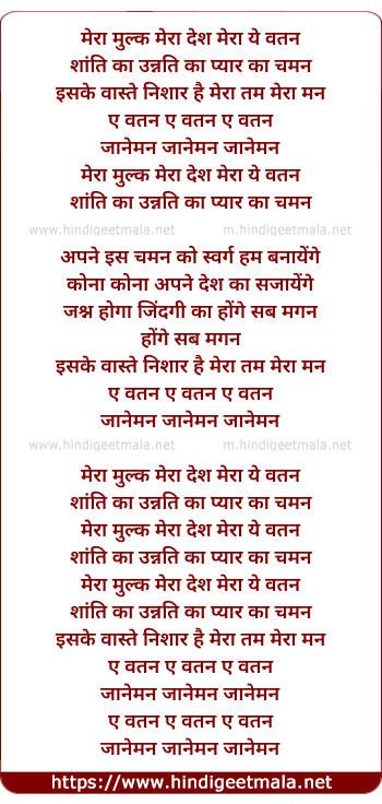 Lyrics of Mera Mulk Mera Desh Mera Ye Watan - मेरा मुल्क मेरा देश मेरा ये वतन