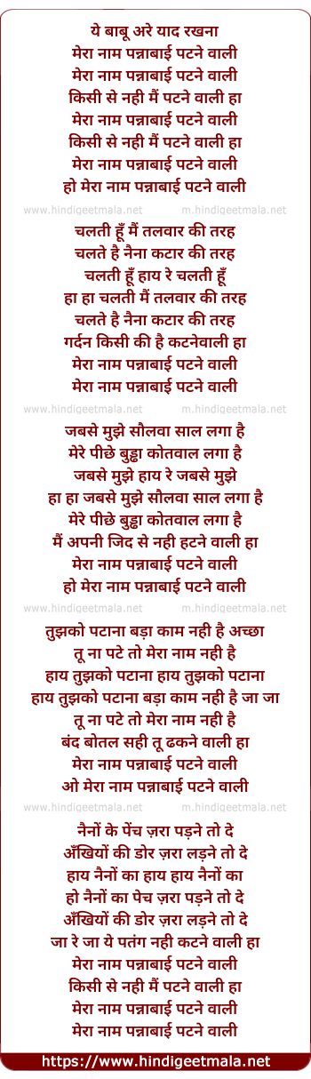 Lyrics of Mera Naam Pannabai Patane Waali - मेरा नाम पन्नाबाई पटने वाली