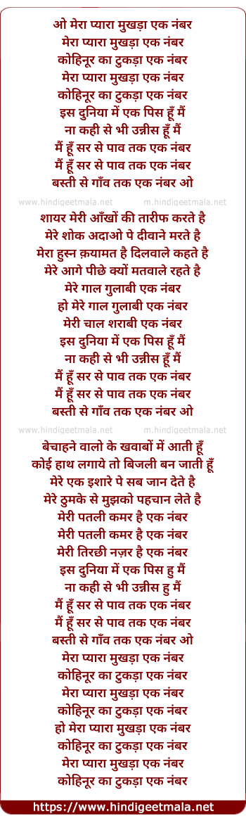 Lyrics of Mera Pyara Mukhda Ek Number - मेरा प्यारा मुखड़ा एक नंबर
