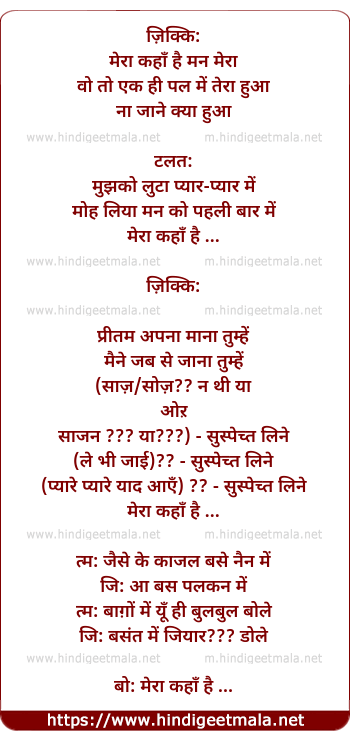 Lyrics of Meraa Kaha Hai Man Meraa - ज़िक्कि: