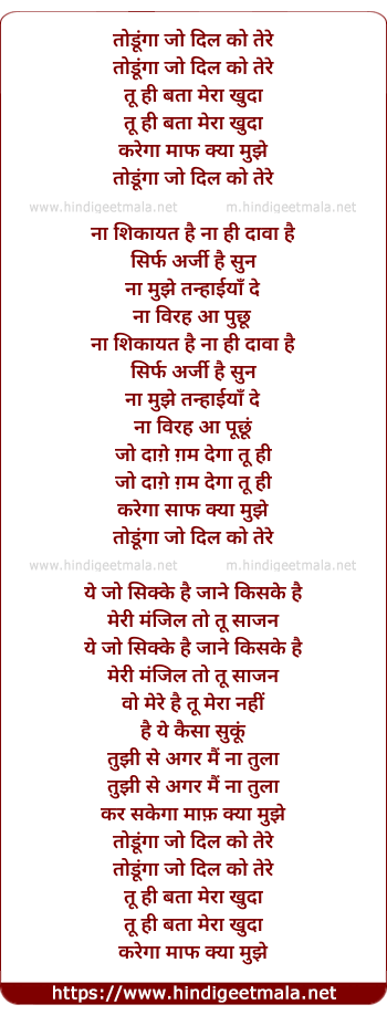 Lyrics of Meraa Khuda - तोडूंगा जो दिल को तेरे