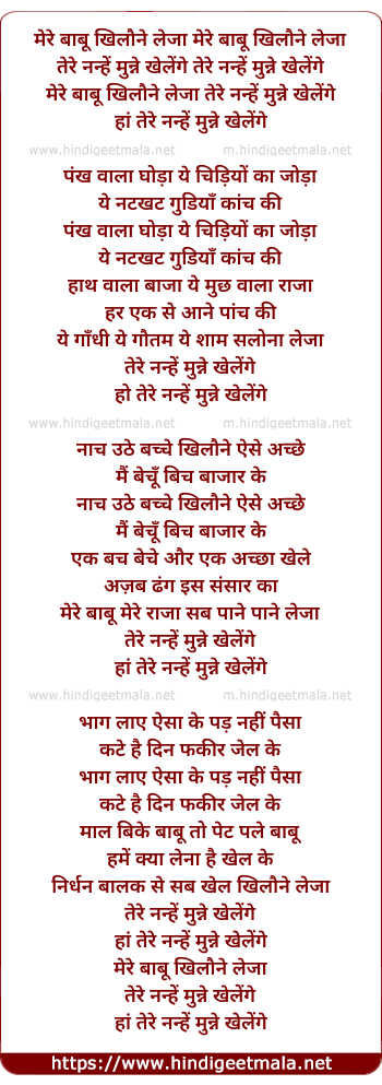 Lyrics of Mere Babu Khilona Leja, O Tere Nanne Munhe Khelege - मेरे बाबू खिलौने लेजा, ओ तेरे नन्हें मुन्ने खेलेंगे