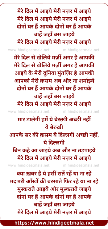 Lyrics of Mere Dil Me Aayiye Meri Najar Me Aayiye - मेरे दिल में आइये मेरी नज़र में आइये