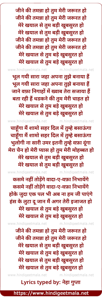 Lyrics of Mere Khayaal Se Tum - मेरे ख्याल से तुम