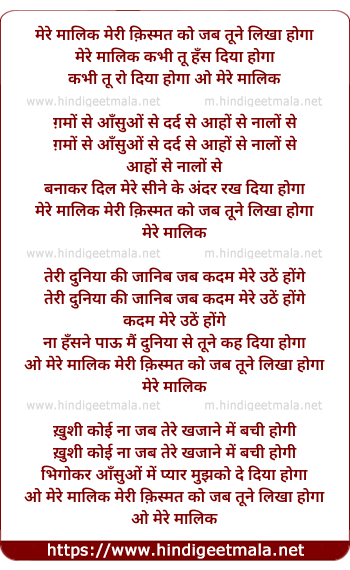 Lyrics of Mere Malik Meri Kismat Ko Jabb Tune - मेरे मालिक मेरी क़िस्मत को जब तूने