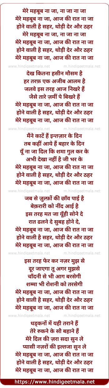 Lyrics of Mere Mehboob Na Ja, Aaj Ki Raat Na Ja - मेरे महबूब ना जा, आज की रात ना जा