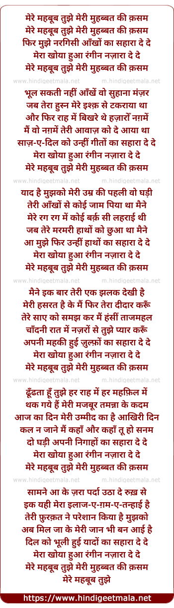 Lyrics of Mere Mehboob Tujhe, Meri Mohabbat Ki Kasam - मेरे महबूब तुझे, मेरी मोहब्बत की क़सम