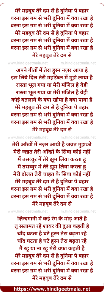 Lyrics of Mere Mehbub Tere Dum Se Hai - मेरे महबूब तेरे दम से है दुनिया पे बहार