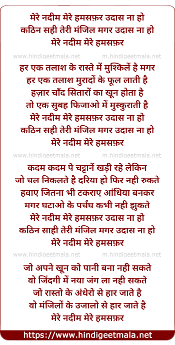 Lyrics of Mere Nadim Mere Humsafar Udas Na Ho - मेरे नदीम मेरे हमसफ़र उदास ना हो