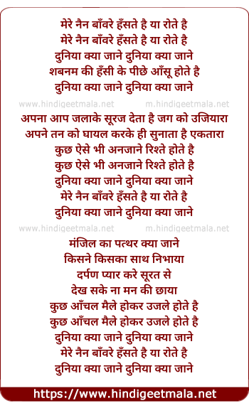 Lyrics of Mere Nayan Baaware Hanste Hai Ya Roote Hai Duniya Kya Jaane - मेरे नैन बाँवरे हँसते है या रोते है दुनिया क्या जाने