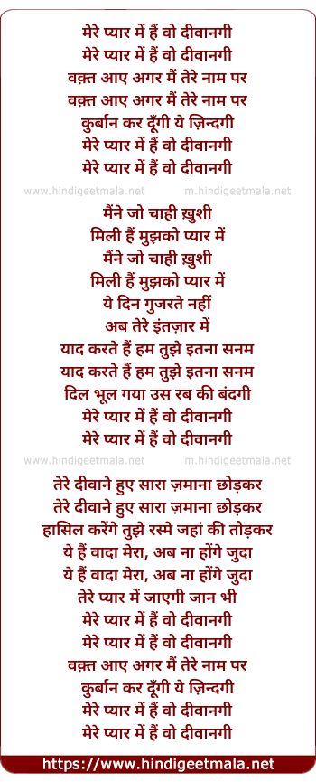 Lyrics of Mere Pyar Me Hai Woh Diwangi - मेरे प्यार में हैं वो दीवानगी