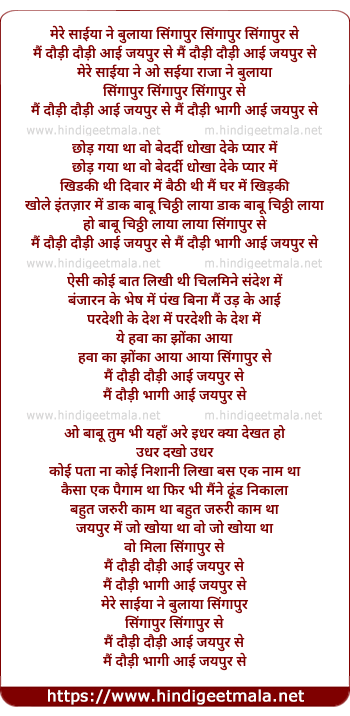Lyrics of Mere Saiyya Ne Bulaya Singapore Se - मेरे सैया ने बुलाया सिंगापुर से