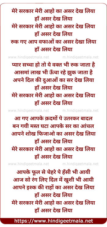 Lyrics of Mere Sarkaar Meri Aahon Ka Asar Dekh Liya - मेरे सरकार मेरी आहो का असर देख लिया