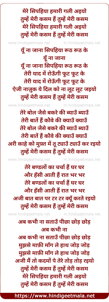 Lyrics of Mere Sipahiya Hamri Gali Aaiyyo - मेरे सिपहिया हमारी गली अइयो