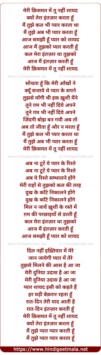 Lyrics of Meri Kismat Me Tu Nahi Sayad - मेरी किस्मत में तू नहीं शायद