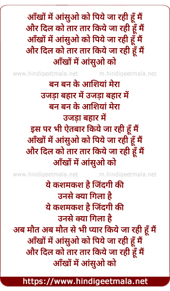 Lyrics of Meri Aankho Me Ye Aansu Nahi - आँखों में आंसुओ को पिये जा रही हूँ मैं