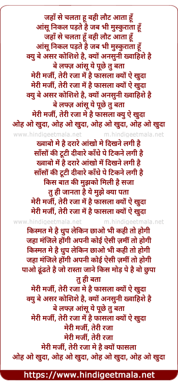 Lyrics of Meri Marzi Teri Raza - मेरी मर्ज़ी तेरी राजा