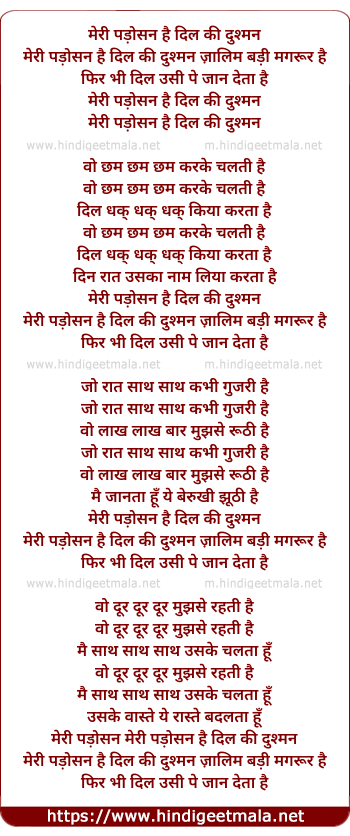 Lyrics of Meri Padosan Hai Dil Ki Dushman - मेरी पड़ोसन है दिल की दुश्मन