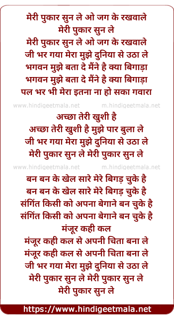 Lyrics of Meri Pukaar Sun Le - मेरी पुकार सुन ले ओ जग के रखवाले