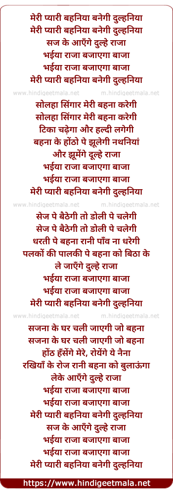 Lyrics of Meri Pyari Behaniya - मेरी प्यारी बहनिया बनेगी दुल्हनिया