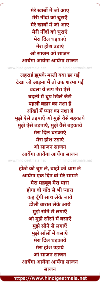 Lyrics of Meri Khwabo Me Jo Aaye - मेरे खाबों में जो आये