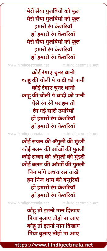 Lyrics of Mero Saiyan Gulabiya Ka Phul - मेरो सैया गुलबियो को फूल
