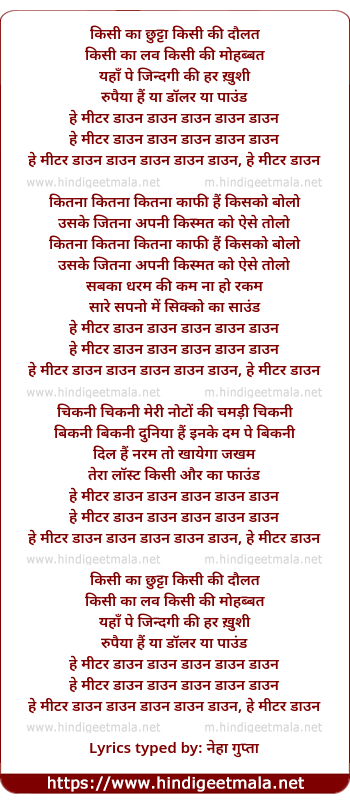 Lyrics of Meter Down (Rock N Roll Mix) - किसी का छुट्टा किसी की दौलत
