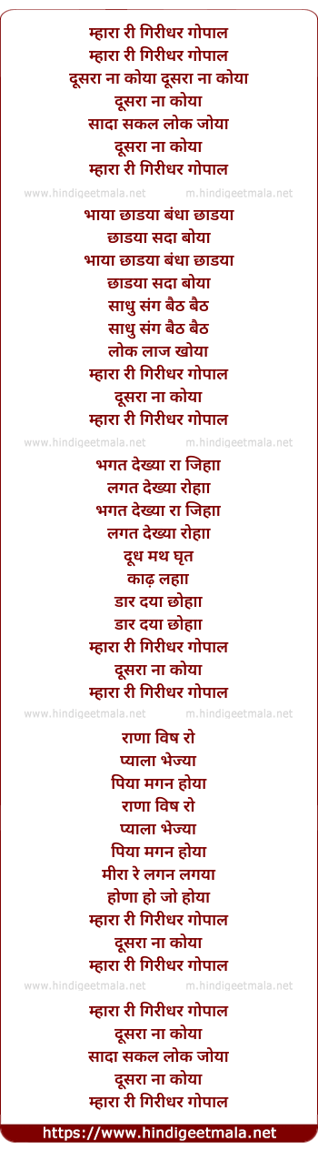 Lyrics of Mhara Re Giridhar Gopaal - म्हारा रे गिरिधर गोपाल