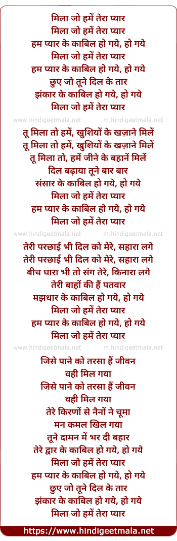 Lyrics of Mila Jo Hume Tera Pyar, Hum Pyar Ke Kabil Ho Gaye (Female) - मिला जो हमें तेरा प्यार, हम प्यार के काबिल हो गये