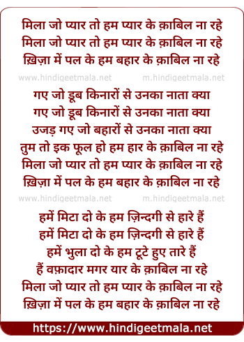 Lyrics of Milaa Jo Pyaar To Ham Pyaar Ke Qaabil Naa Rahe - मिला जो प्यार तो हम प्यार के क़ाबिल ना रहे