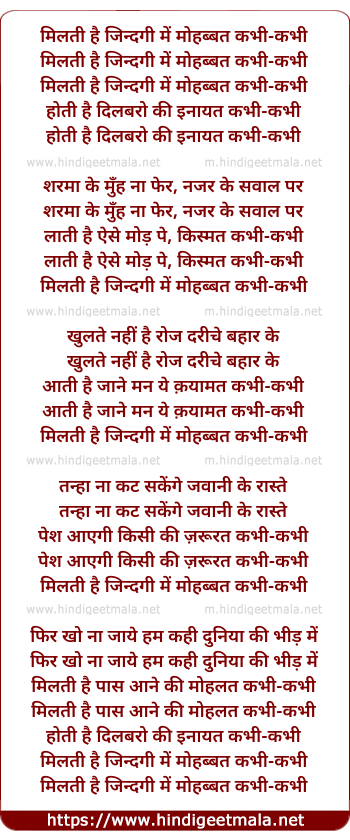Lyrics of Milati Hai Zindagi Men Mohabbat Kabhi Kabhi - मिलती है जिन्दगी में मोहब्बत कभी-कभी