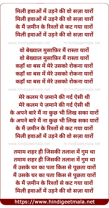 Lyrics of Mili Havaaon Men Udane Ki Vo Sazaa Yaaro - मिली हवाओं में उड़ने की वो सज़ा यारों