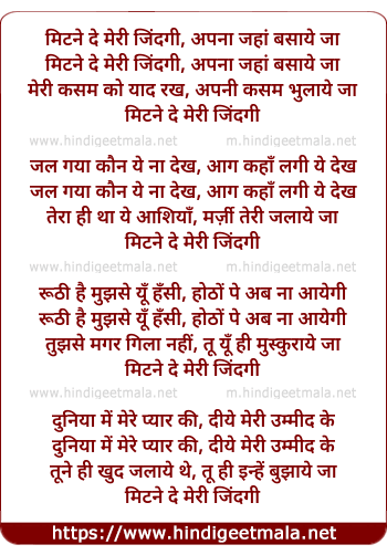 Lyrics of Mitne De Meri Zindagi Apna Jaha Basaye Ja - मिटने दे मेरी जिंदगी अपना जहां बसाये जा