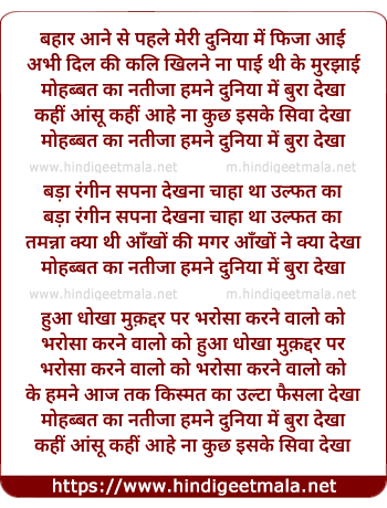 Lyrics of Mohabbat Ka Nateeja Humne Duniya Me Bura Dekha - मोहब्बत का नतीजा हमने दुनिया में बुरा देखा