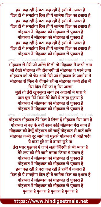 Lyrics of Mohabbat Ne Mohabbat Ko Mohabbat Se Pukara Hai - मोहब्बत ने मोहब्बत को मोहब्बत से पुकारा है