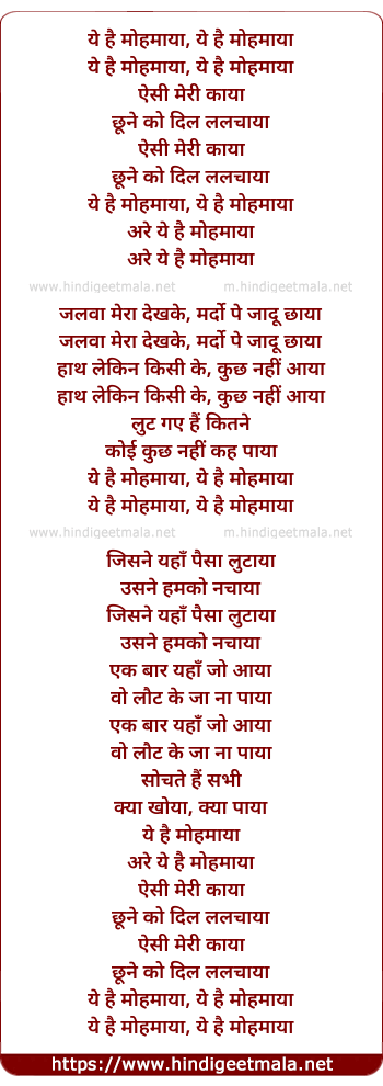Lyrics of Ye Hai Mohamaya - ये है मोहमाया