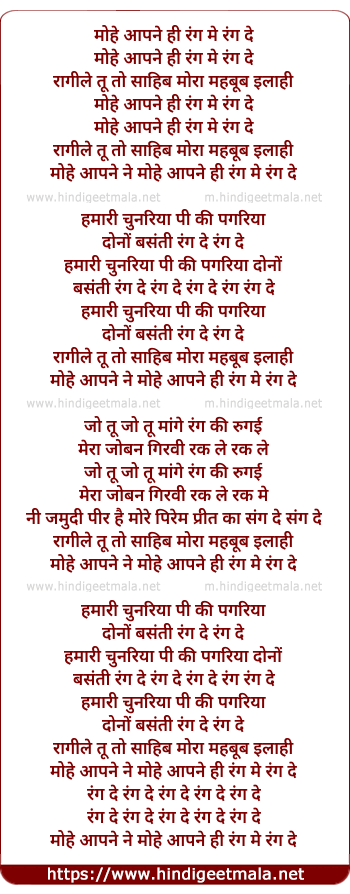 Lyrics of Mohe Apne Hi Rang Me Rang De - मोहे आपने ही रंग मे रंग दे