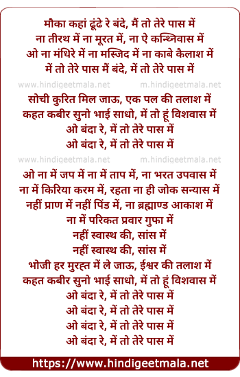 Lyrics of Moko Kaha Dhunde Re Bande (Banda Re) - मोको कहा ढूंढे रे बंदे
