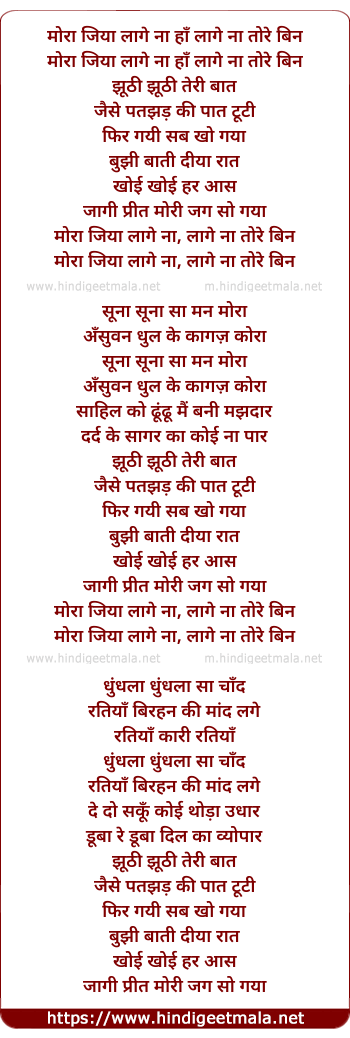 Lyrics of Mora Jiya Laage Na Tore Bin - मोरा जिया लागे ना तोरे बिन