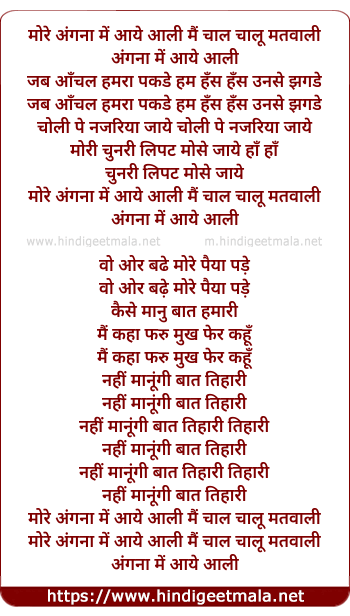 Lyrics of More Angana Me Aaye Aali - मोरे अंगना में आये आली मैं चाल चालू मतवाली