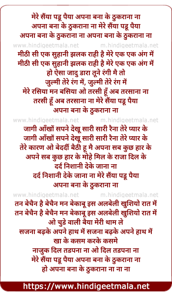 apna bana ke thukarana na mere saiya padu paiya