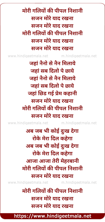 Lyrics of Mori Galiyo Ki Peepal Nishani - मोरी गलियों की पीपल निशानी