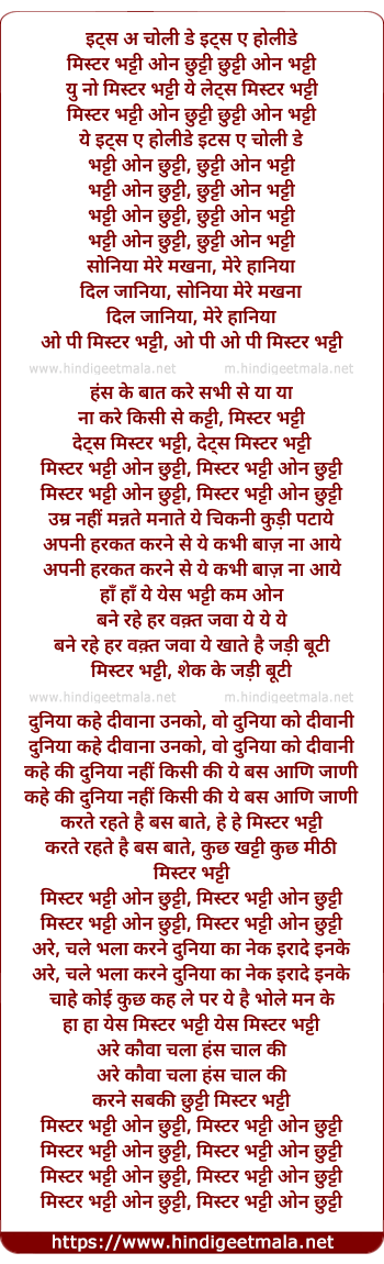 Lyrics of Mr. Bhatti On Chuttii - मिस्टर भट्टी ओन छुट्टी