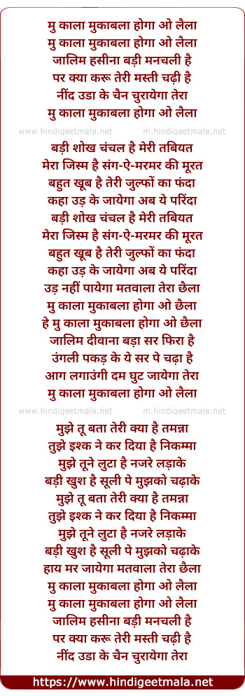 Lyrics of Mu Kaalaa Mukaabalaa Hogaa O Lailaa - मु काला मुकाबला होगा ओ लैला