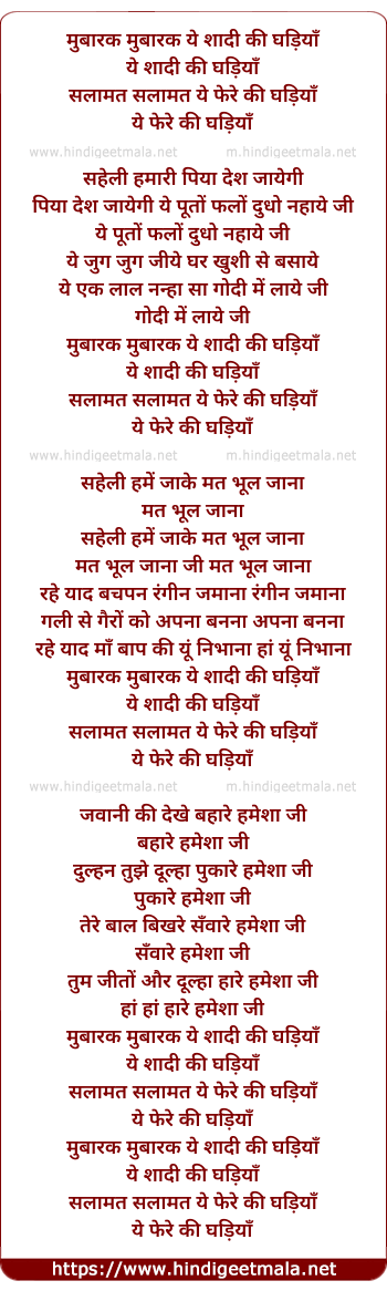 Lyrics of Mubaarak Mubaarak Yeh Shaadi Ki Ghadiyaan - मुबारक मुबारक ये शादी की घड़ियाँ