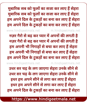 Lyrics of Mubaarik Sabko Phulon Ka Sajaa Kar Laye Hain Sahara - मुबारिक सब को फूलों का सजा कर लाये हैं सेहरा