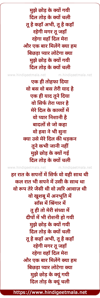 Lyrics of Mujhe Chod Ke Kyo Gayi (Male) - मुझे छोड़ के क्यों गयी