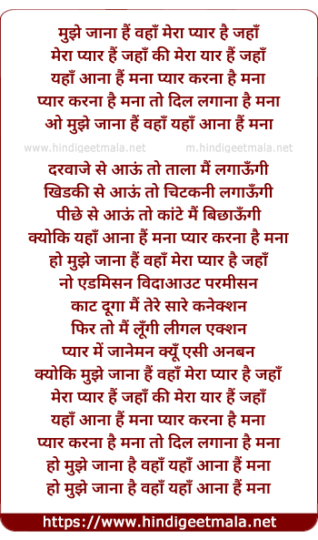 Lyrics of Mujhe Jana Hain Wahan Mera Pyaar Hain Jahan - मुझे जाना हैं वहाँ मेरा प्यार है जहाँ