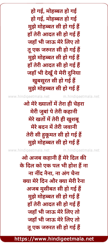 Lyrics of Mujhe Mohabbat Si Ho Gai - हो गई, मोहब्बत हो गई